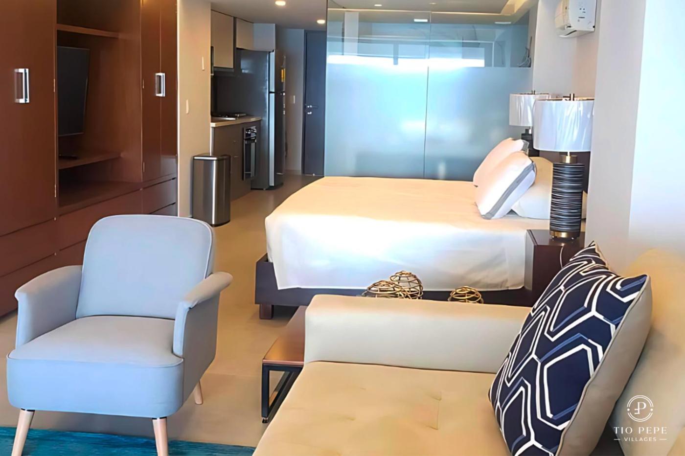 Studio Apartment. This apartments standout feature is the sauna. This spacious apartment is comprised of 1 bedroom, a kitchen and 1 bathroom with a shower. Meals can be prepared in the well-fitted kitchen, which is fitted with a refrigerator, kitchenware and a microwave. The air-conditioned apartment offers a TV, a washing machine, a tea and coffee maker, tumble dryer as well as sea views. The unit offers 2 beds.